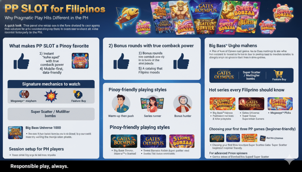 If you hang out in Philippine online casinos, you’ve definitely seen PP SLOT (Pragmatic Play). It’s the studio behind viral favorites like Big Bass, Gates of Olympus, and a growing wave of Megaways™ titles. For Pinoy players, PP SLOT has the sweet spot: easy-to-learn gameplay, explosive bonus rounds, and mobile-first polish that runs smoothly on spotty data. In short—walang arte, puro saya at potential.